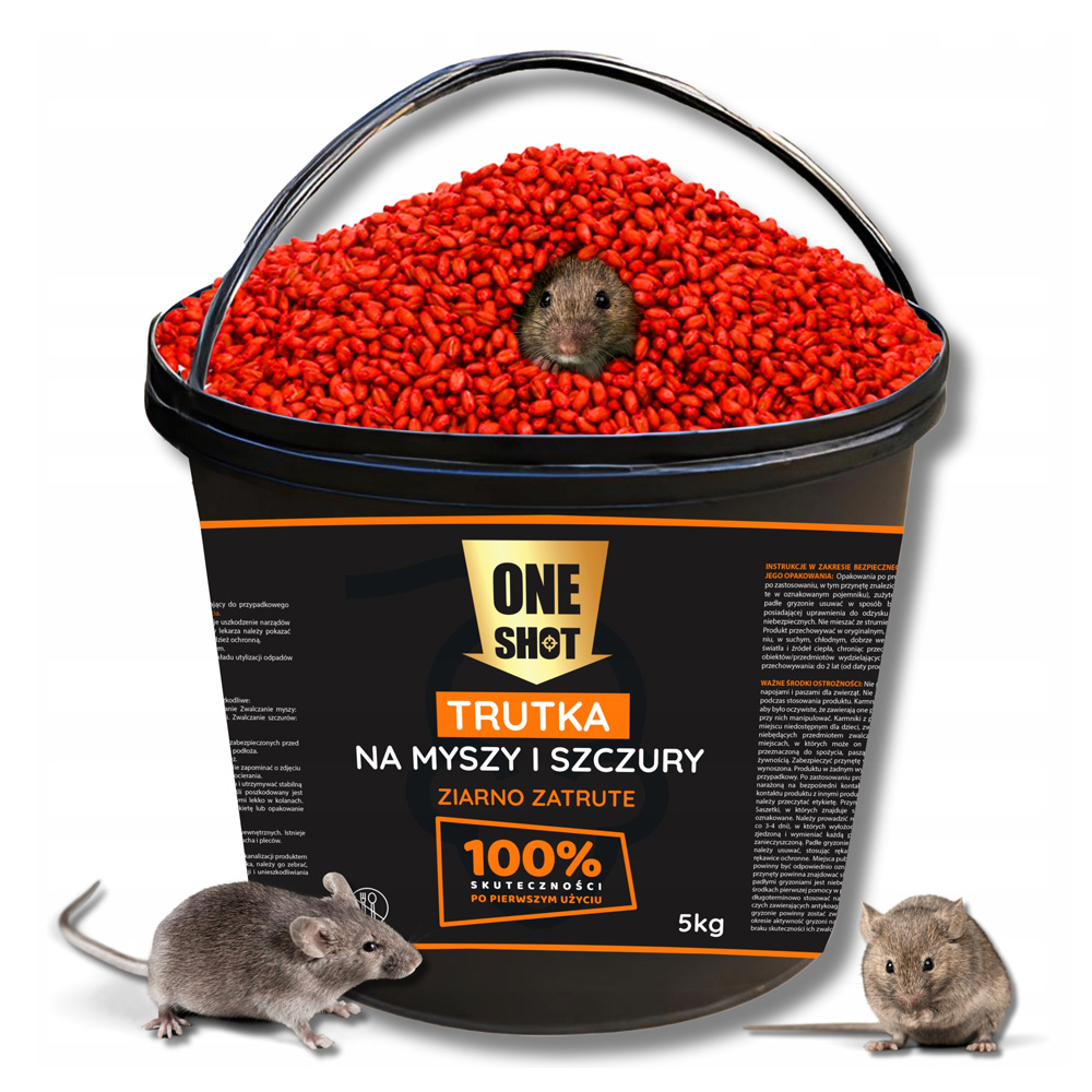 ONE SHOT 5 kg ziarno zatrute to niezwykle skuteczne i wydajne ziarno na myszy i szczury, które zostało stworzone z myślą o użytkownikach potrzebujących szybkich i zauważalnych efektów. Produkt świetnie sprawdza się zarówno w domach, jak i w gospodarstwach, fermach, magazynach czy zakładach produkcyjnych. Dzięki starannie dobranemu składowi i atrakcyjności pokarmowej, ziarno działa nawet w środowiskach, w których gryzonie mają dostęp do pełnowartościowego pożywienia. Co więcej, odpowiednia forma produktu umożliwia łatwe i precyzyjne rozmieszczenie trutki w miejscach, w których gryzonie najczęściej się poruszają.